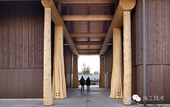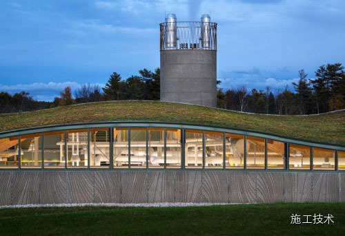 建筑物的桁架為膠合層壓板,從而優(yōu)化了這種可再生資源的結(jié)構(gòu)價(jià)值。膠合板消耗能源少于鋼筋混凝土或鋼材,可用于更長的時(shí)間跨度,可承受重負(fù)荷,并且擁有復(fù)雜 的形狀。該建筑通過了LEED環(huán)境保護(hù)認(rèn)證,包括一套可再生的膠合板結(jié)構(gòu)系、節(jié)水管道夾具、利用可回收的當(dāng)?shù)夭牧稀⑹覂?nèi)擁有豐富的自然光線以及高效的機(jī)械 系統(tǒng)、照明和外表皮。