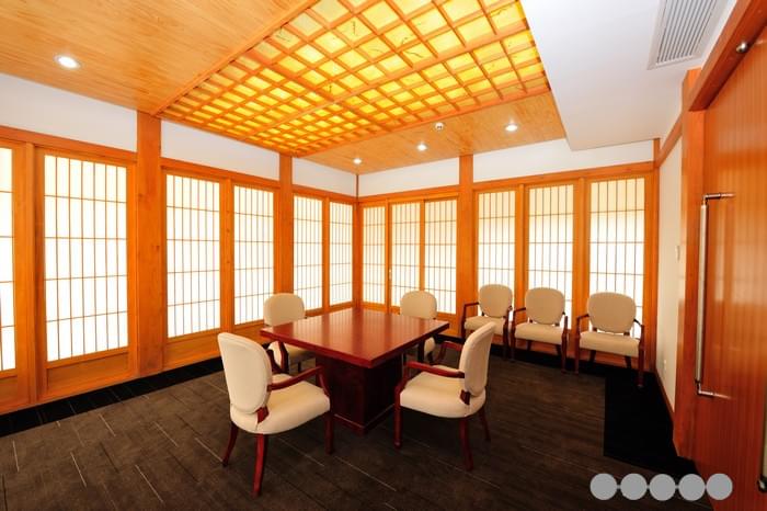 百花園日式木建筑四周有日式的圍廊和陽臺,但采用的是花旗松膠合主柱和鐵杉防腐木地板。一樓和二樓均采用了大面積的和式移動門窗,裝飾以日本進口的幛子紙,透光而不透視,而所有日式門窗均采用溫潤細膩、耐腐抗變形的加拿大黃柏。循花旗松實木樓梯拾級而上,是日式茶室、辦公會客室、休息室和秘書室等功能區(qū)劃。整個室內裝飾以針葉材實木板條和流白為主,地面是十分日本式的青石板,頂部的日式燈具均用直紋的花旗松實木在工廠定制而成。
