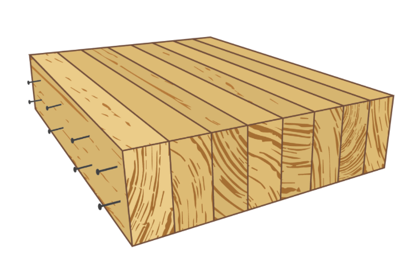 在加拿大和美國(guó),其更多被用于六層或者更高的木結(jié)構(gòu)建筑當(dāng)中。NLT是利用2x4, 2x6, 2x8, 2x10, or 2x12尺寸的規(guī)格材木材通過(guò)釘連接的方式進(jìn)行組合形成的結(jié)構(gòu)板。樓板上方或下方通常會(huì)覆蓋結(jié)構(gòu)膠合板或者定向刨花板來(lái)提高其結(jié)構(gòu)跨度和穩(wěn)定性。