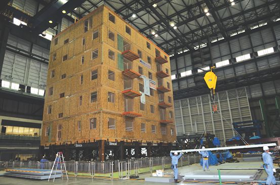 圖:早年在日本三木市進(jìn)行的六層足尺寸木結(jié)構(gòu)振動(dòng)臺(tái)試驗(yàn),模擬了阪神地震強(qiáng)度,結(jié)果證明建筑物結(jié)構(gòu)完整性良好