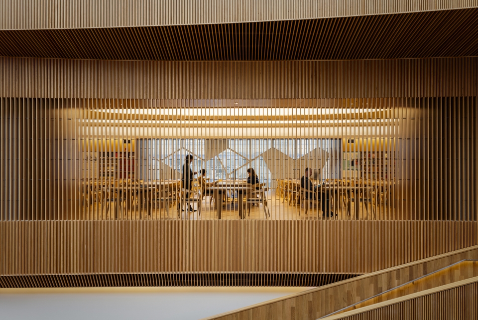 圖書館共有六層,分布著各種空間,比如數(shù)字空間,模擬空間,群體空間以及個人互動空間。圖書館頂層是大閱覽室,建筑師在設計時,把它構想成藏在圖書館的珠寶盒,人們可以在這兒潛心研究,尋找靈感。進入大閱覽室之前要先經過一個過渡空間,過渡空間光線柔和,聲效優(yōu)良。室內利用木質格柵而非實體墻壁來環(huán)繞空間,這樣既保證了隱私,又有一定的可見度。陽光透過木條的縫隙照亮了中庭和西立面之間的空間。