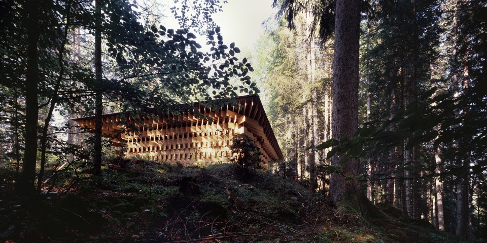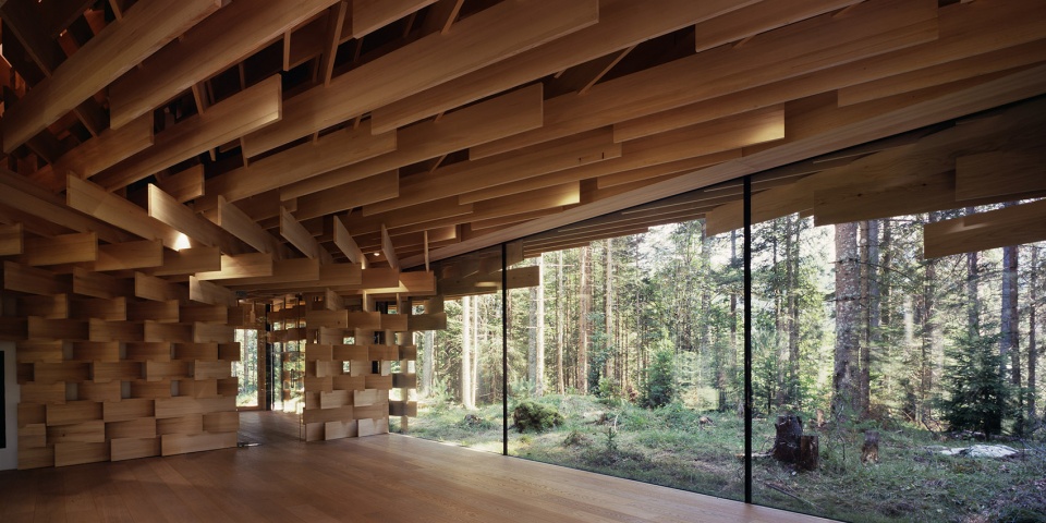 該建筑以生長在場地附近的冷杉樹為主要材料,3厘米寬的木板像樹枝一樣堆疊起來,在廣闊的森林和精致的建筑間形成一種柔和的過渡。小屋同樣也充當(dāng)了使人融入森林的媒介。陽光透過枝葉間的縫隙從天窗透進室內(nèi),帶來森林中常??梢泽w驗到的“komorebi”(木漏れ日)般的效果。