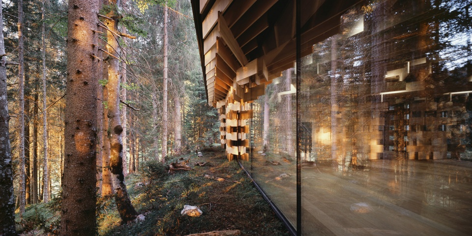 ▼堆疊的冷杉木板在森林和建筑間形成一種柔和的過渡