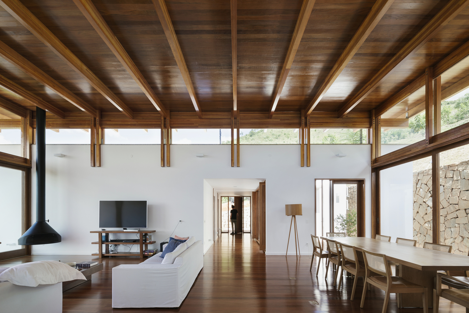 在中庭中,外部與內(nèi)部的聯(lián)系逐漸增強(qiáng),結(jié)構(gòu)從其他房間生長出的遮蓋構(gòu)件亦如是。磚石平面中吸引人的木質(zhì)細(xì)部,除了能夠儲存建造過程的記憶,反應(yīng)混凝土柱的支撐桿以外,還可以將光線引入入口,以及增強(qiáng)對外部空間的感知。其中的空間,從最外部到最內(nèi)部,采用了方形的外觀。幾乎全部的外部空間,幾乎全部的內(nèi)部空間。光線,空氣,人群以及景觀互相互動。