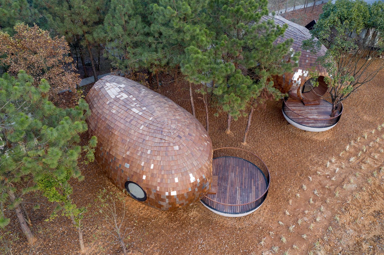 種子木屋整體呈橢球形,底部采用鏡面鋁板,往高處漸變?yōu)槟就摺gR面鋁板隨著季節(jié)、天氣的變化,反射周圍的環(huán)境和氛圍,冬季時是紅土地,春夏季時是綠植,潮濕時是氤氳霧氣,晴天時是明媚陽光。鏡面鋁板是種子屋落地生根的部分,上部的木瓦則使建筑逐漸回歸自然柔和的本質(zhì)。