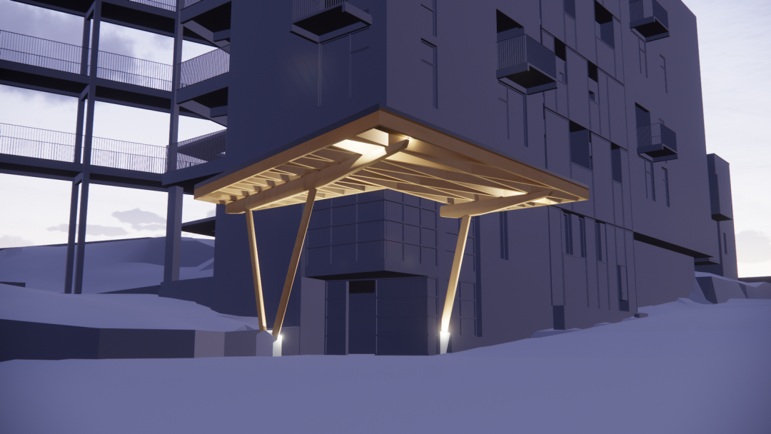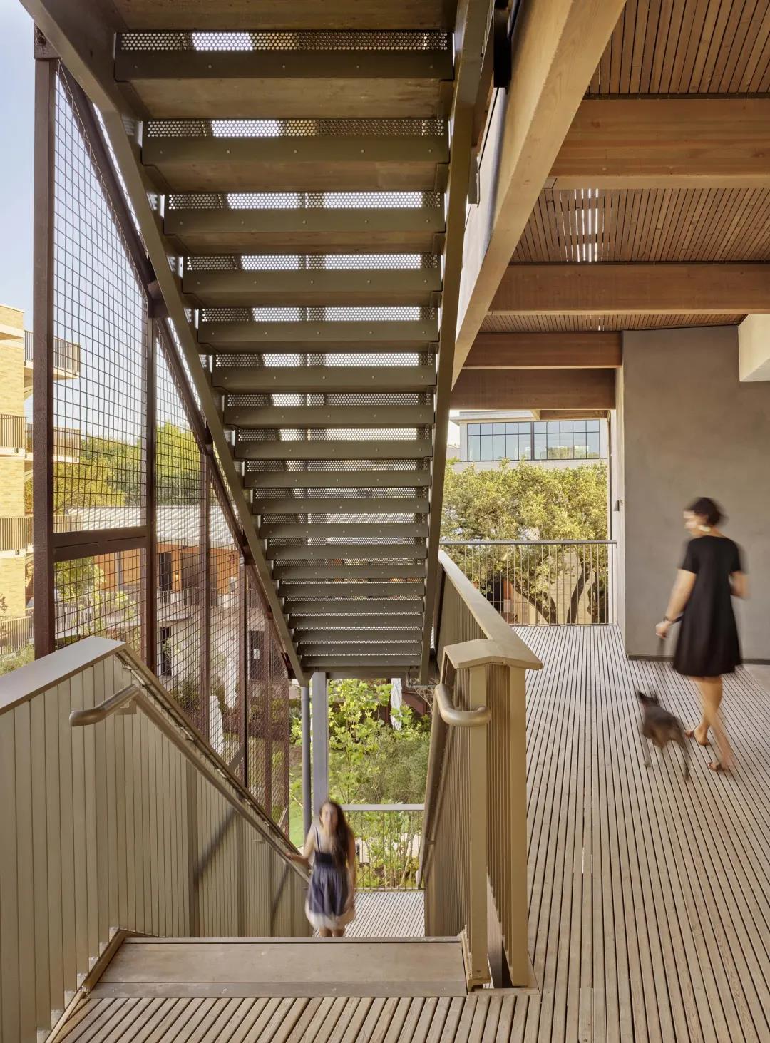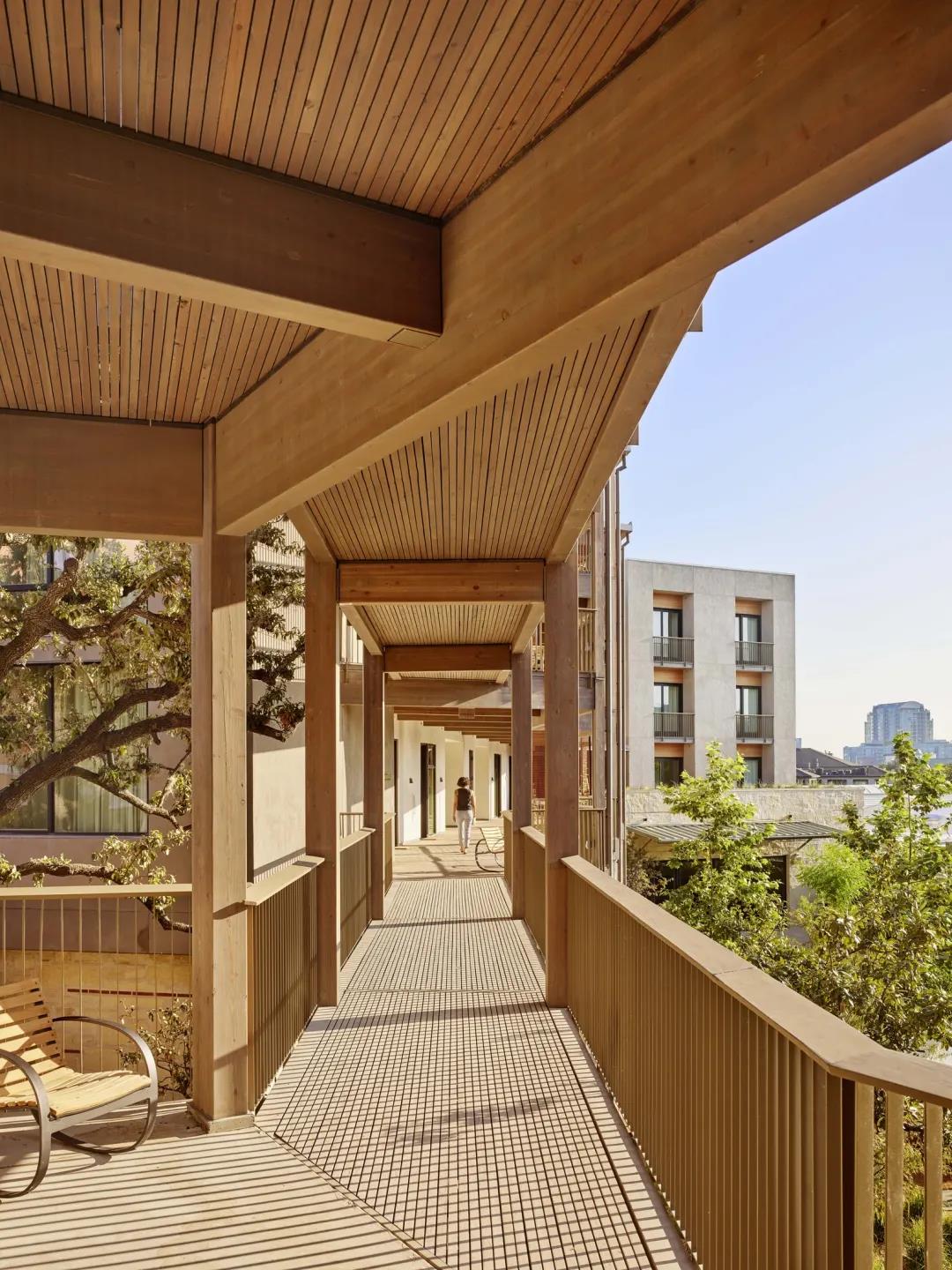 除此之外,還有其他幾處使用了定制的木結(jié)構(gòu)建筑構(gòu)件,其中包括 DLT 電梯和樓梯井、懸掛式陽(yáng)臺(tái)、樓梯以及入口處的獨(dú)立門(mén)廊。
