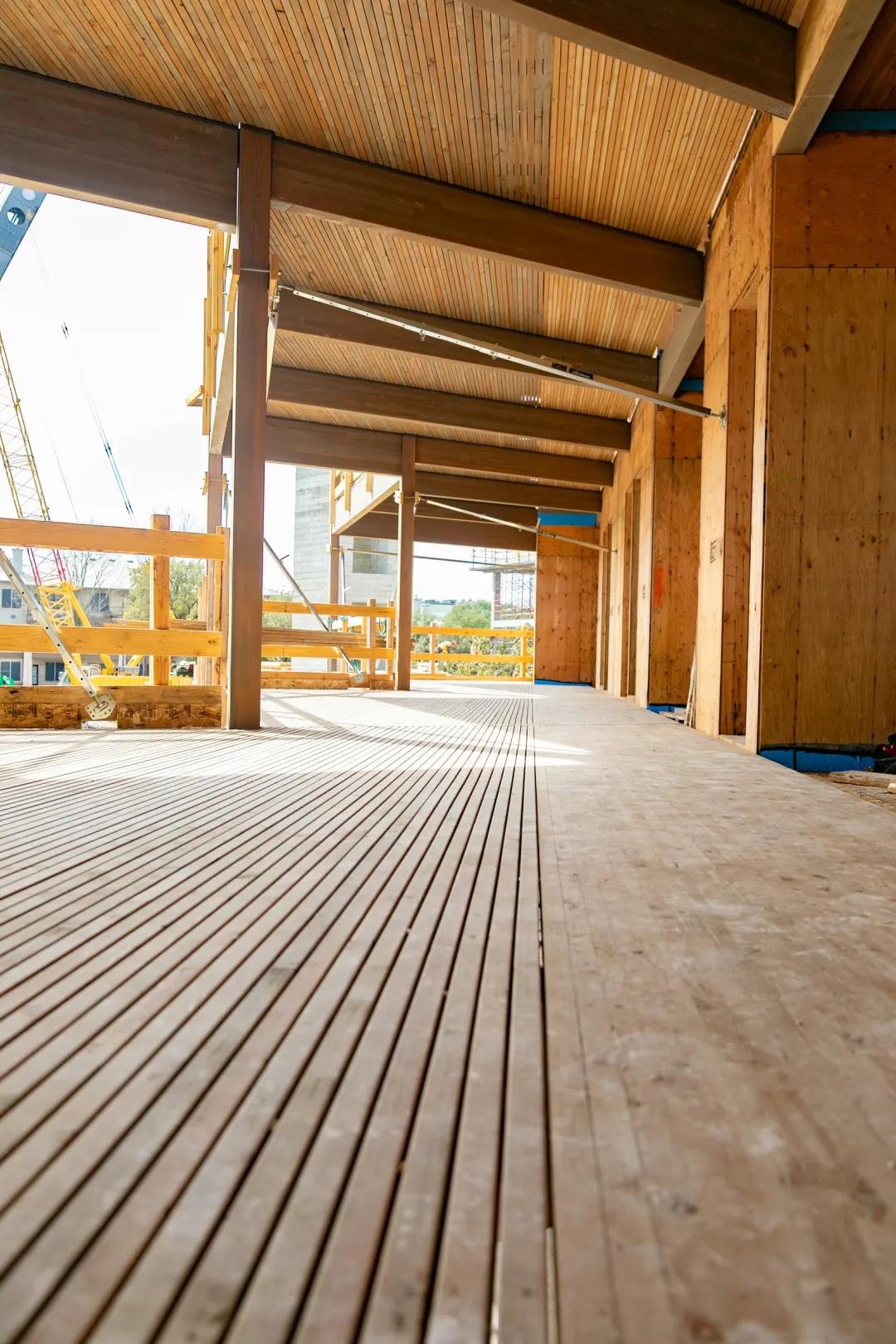 StructureCraft 在木材和材料工程方面擁有非常專(zhuān)業(yè)的知識(shí),結(jié)構(gòu)工程團(tuán)隊(duì)將內(nèi)部 SPF 、DLT 面板用到木質(zhì)走道的設(shè)計(jì)中,膠合木梁柱支撐了樓板。