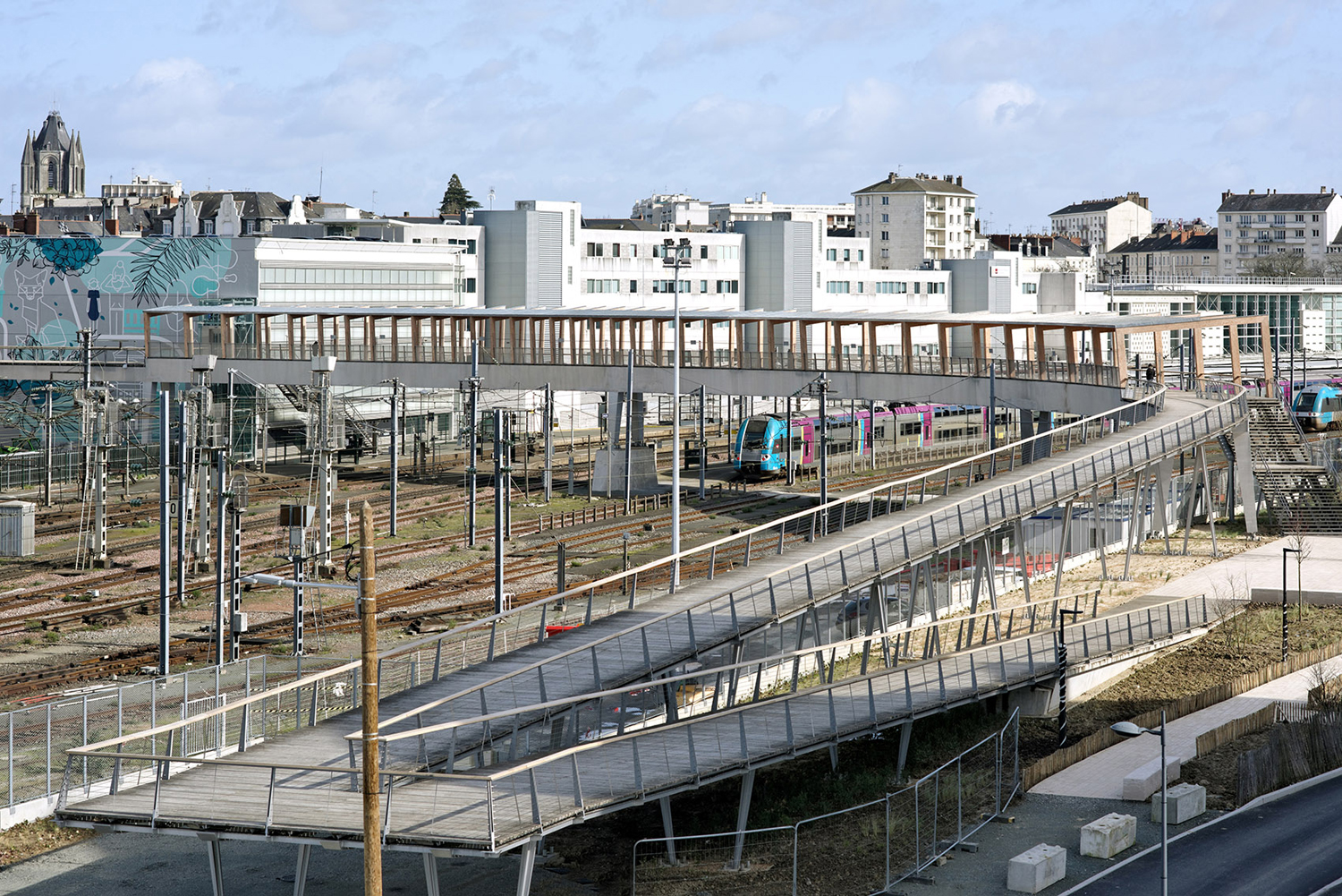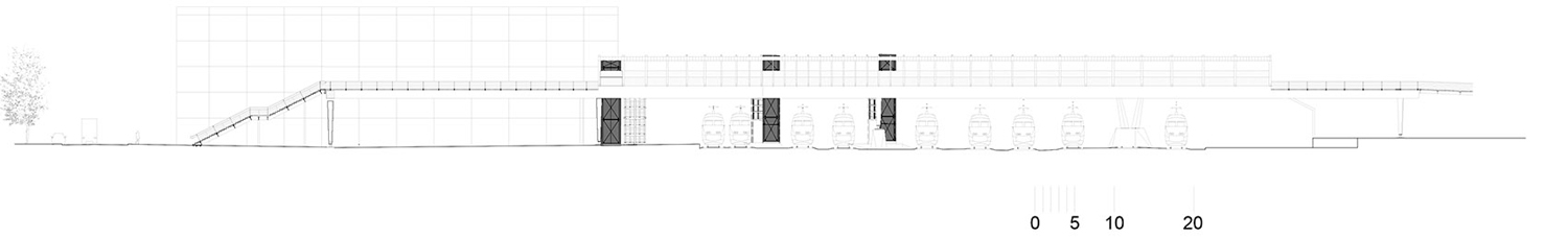 城市開發(fā)計(jì)劃對(duì)這片區(qū)域進(jìn)行升級(jí)。車站一側(cè)的Auguste Gaultier大道上已經(jīng)建造了一棟辦公樓和一座多層停車場(chǎng);另有一棟酒店正在施工。鐵軌南側(cè)的Fulton街上則將建設(shè)一條新的散步道。這座供行人和自行車使用的天橋是區(qū)域現(xiàn)代化的一部分,由獲得競(jìng)賽優(yōu)勝的Dietmar Feichtinger建筑事務(wù)所負(fù)責(zé)設(shè)計(jì)。他們的設(shè)計(jì)遵循城市尺度,跨越鐵軌形成的屏障,并且設(shè)置電梯和樓梯,幫助身體不便的人直接到達(dá)站臺(tái)。