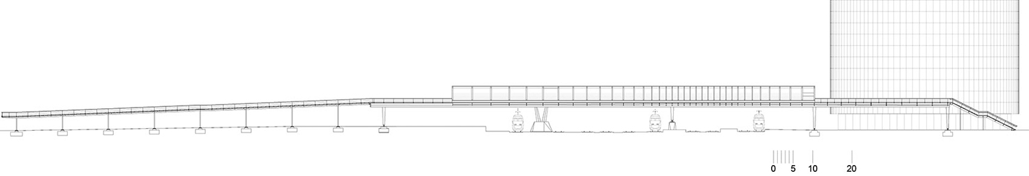Dietmar Feichtinger建筑事務(wù)所在昂熱Saint-Laud火車站設(shè)計(jì)了一座新的橋梁,供行人和自行車使用。橋梁呈柔軟的弧線形,跨越總寬度達(dá)70米的一道道鐵軌,融入到城市的地形之中。橋面由中空箱體和鋼架組成,弧線西側(cè)整合有木制長椅。項(xiàng)目整體優(yōu)雅而輕盈,將不同地區(qū)連接在一起。由膠合木梁組層面的框架支撐屋頂和照明系統(tǒng),呈現(xiàn)出驚人的效果,使橋梁成為一個(gè)吸睛的新地標(biāo)。橋的剖面不斷變化,形成動(dòng)態(tài)的空間,讓人們?cè)谶M(jìn)入、爬上樓梯、漫步、等待、坐下休息、觀看和離開等行為狀態(tài)下體會(huì)到不同的空間特點(diǎn)。項(xiàng)目為一個(gè)單體結(jié)構(gòu),尺度與所在區(qū)域相呼應(yīng),施工精美,提升了人們對(duì)該區(qū)域的關(guān)注度?;⌒谓Y(jié)構(gòu)讓橋面可以緩慢抬升,連接新建的Place Giffard-Lagenvin散步道和另一側(cè)的公園。三臺(tái)電梯和樓梯在車站、酒店,以及開往巴黎和南特的火車站臺(tái)之間創(chuàng)造了無障礙連接,方便騎自行車的人使用。橋梁外形美觀,展現(xiàn)了改造后車站地區(qū)的新樣貌。